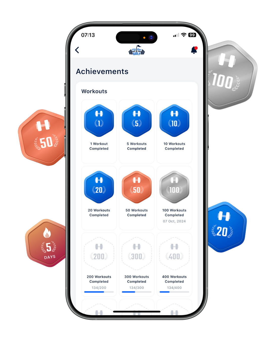 Keep track of how many workouts you have logged on the Fit For Golf App with our Achievements feature. Long term consistency is key to staying fit & healthy!