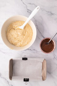 - Pour half the batter into your pre-lined loaf tin and smooth into the corners.