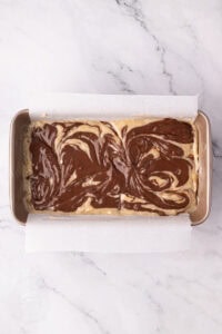 • Swirl Gently: Use a butterknife or skewer to lightly swirl the Nutella through the batter. A few gentle swirls are plenty – overdoing it will mix the Nutella fully into the batter instead.