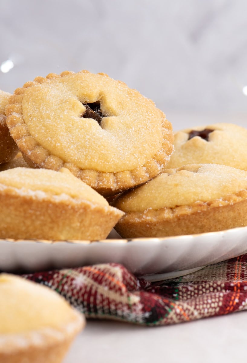 Plateful of classic mince pies arranged on a white dish with festive cloth beneath, perfect for homemade Christmas baking.